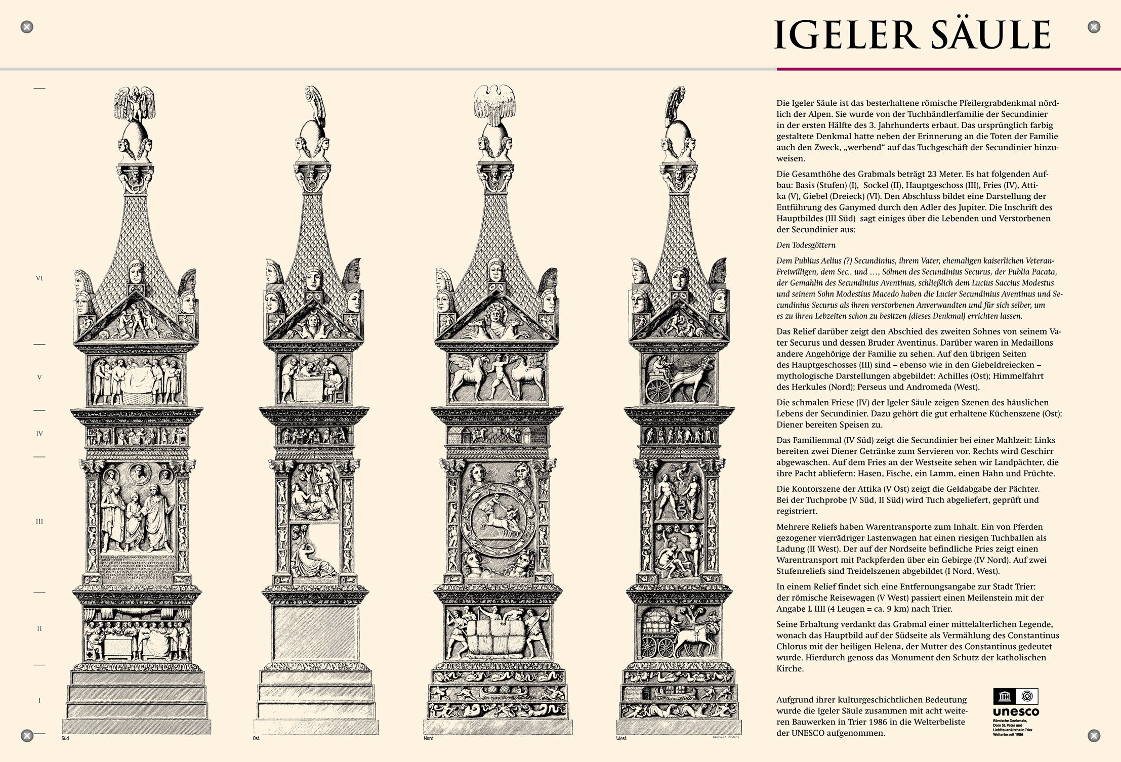 Die Igeler Säule ist das besterhaltene römische Pfeilergrabdenkmal nördlich der Alpen. Sie wurde von der Tuchhändlerfamilie der Secundinier in der ersten Hälfte des 3. Jahrhunderts erbaut. Das ursprünglich farbig gestaltete Denkmal hatte neben der Erinnerung an die Toten der Familie auch den Zweck, „werbend“ auf das Tuchgeschäft der Secundinier hinzuweisen.