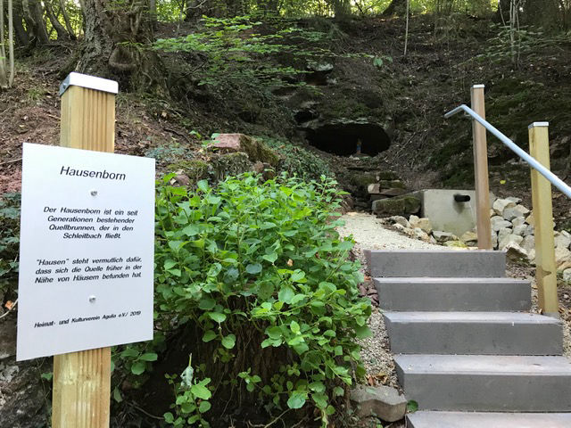 Unsere Arbeitsgruppe Wanderwege hat im Jahr 2019 in 13 Arbeitseinsätzen den Hausenborn saniert. Nachfolgend ein Hinweis auf die Sanierung mit Ortsbestimmung aus unserem Informationsflyer aus dem Oktober 2019: