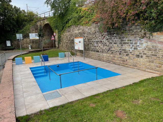 In insgesamt 16 Arbeitseinsätzen und ca. 70 Arbeitsstunden der zehn ehrenamtlichen Helfer und mit Unterstützung der beiden Gemeindearbeiter wurden die alten Waschbetonplatten im Umfeld entfernt und durch helle Steinfliesen ersetzt. Das Tretbecken wurde saniert, neu gestrichen und der Handlauf im Becken montiert.